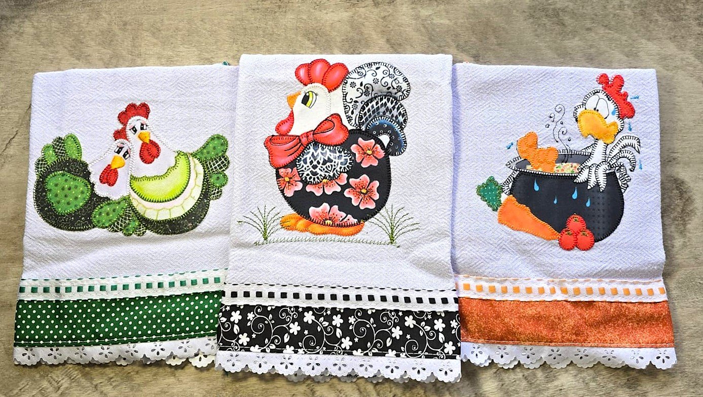 Set di 3 strofinacci in cotone, lavorati a mano:  decorati con delicati ricami che rappresentano simpatiche gallinelle. Tutti i 3 rifiniti con una graziosa bordatura, portano colore, allegria e un tocco artigianale alla tua cucina.