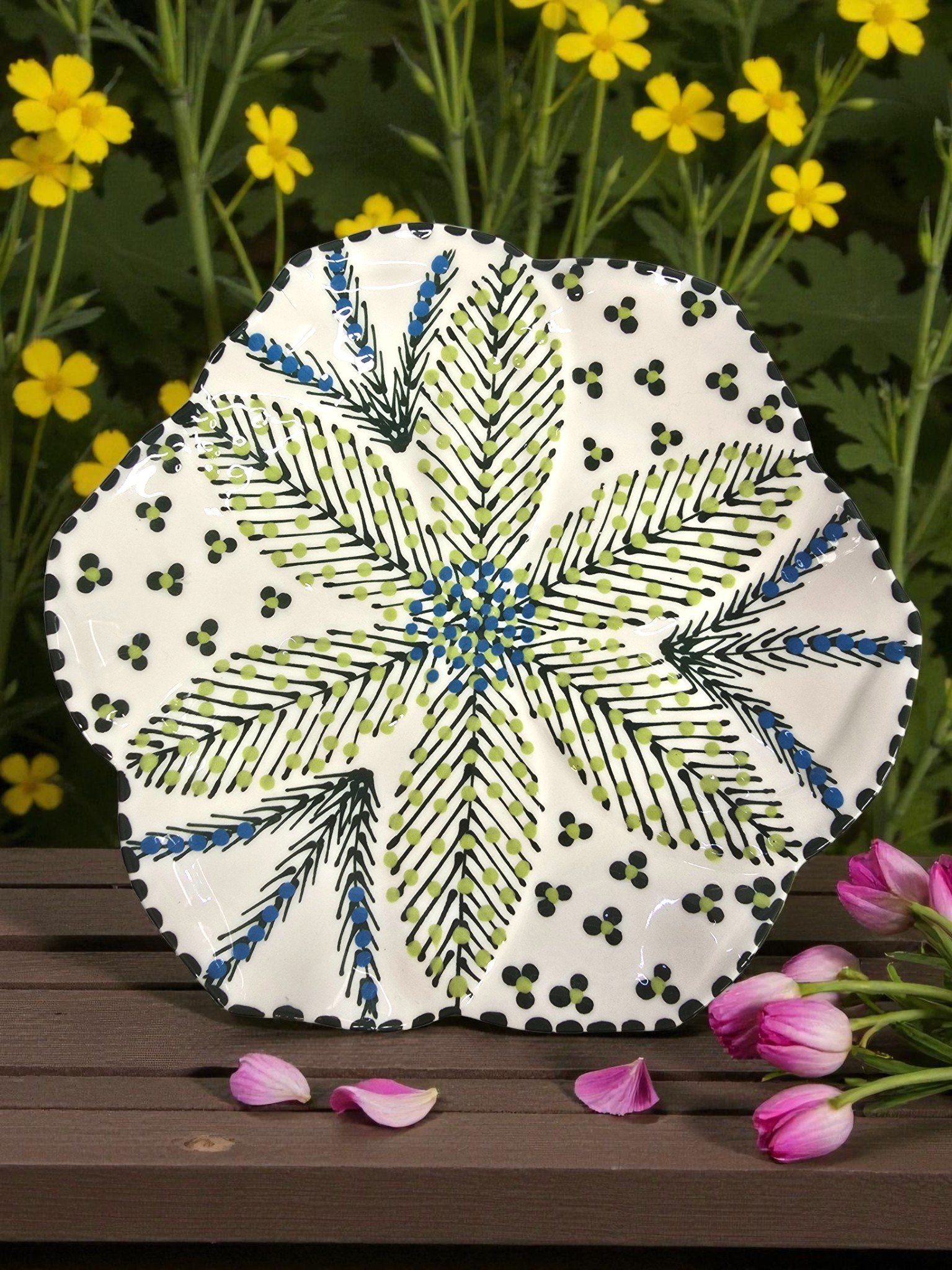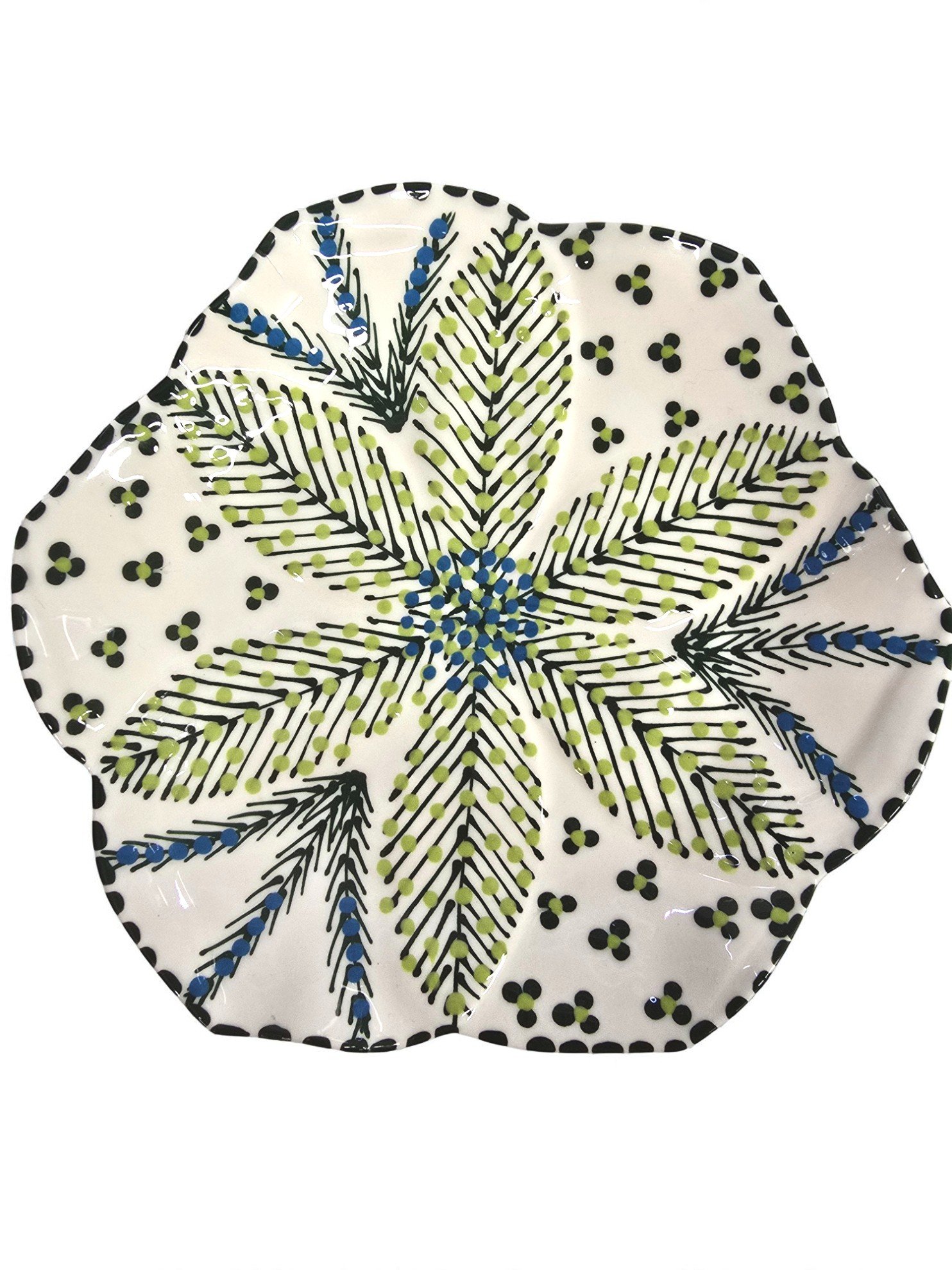 Un pezzo unico, realizzato e dipinto a mano da artigiani del Sudafrica. Interamente realizzato a mano in tutte le fasi e smaltato con colori purissimi e atossici, questo piatto si distingue per le delicate sfumature di verde che evocano freschezza e armonia. Perfetto per decorare la tavola con un tocco naturale ed elegante.