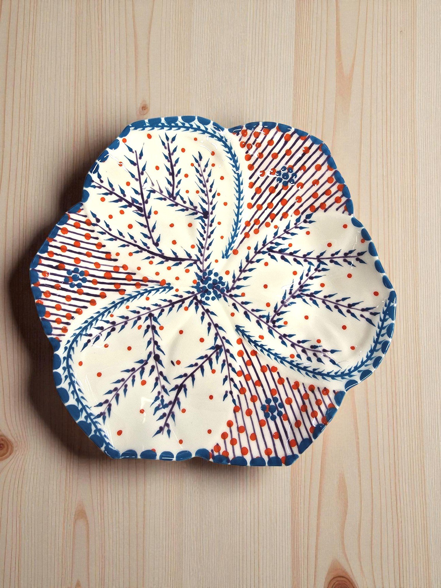 Piatto piccolo in ceramica bianca decorato in blu e rosso