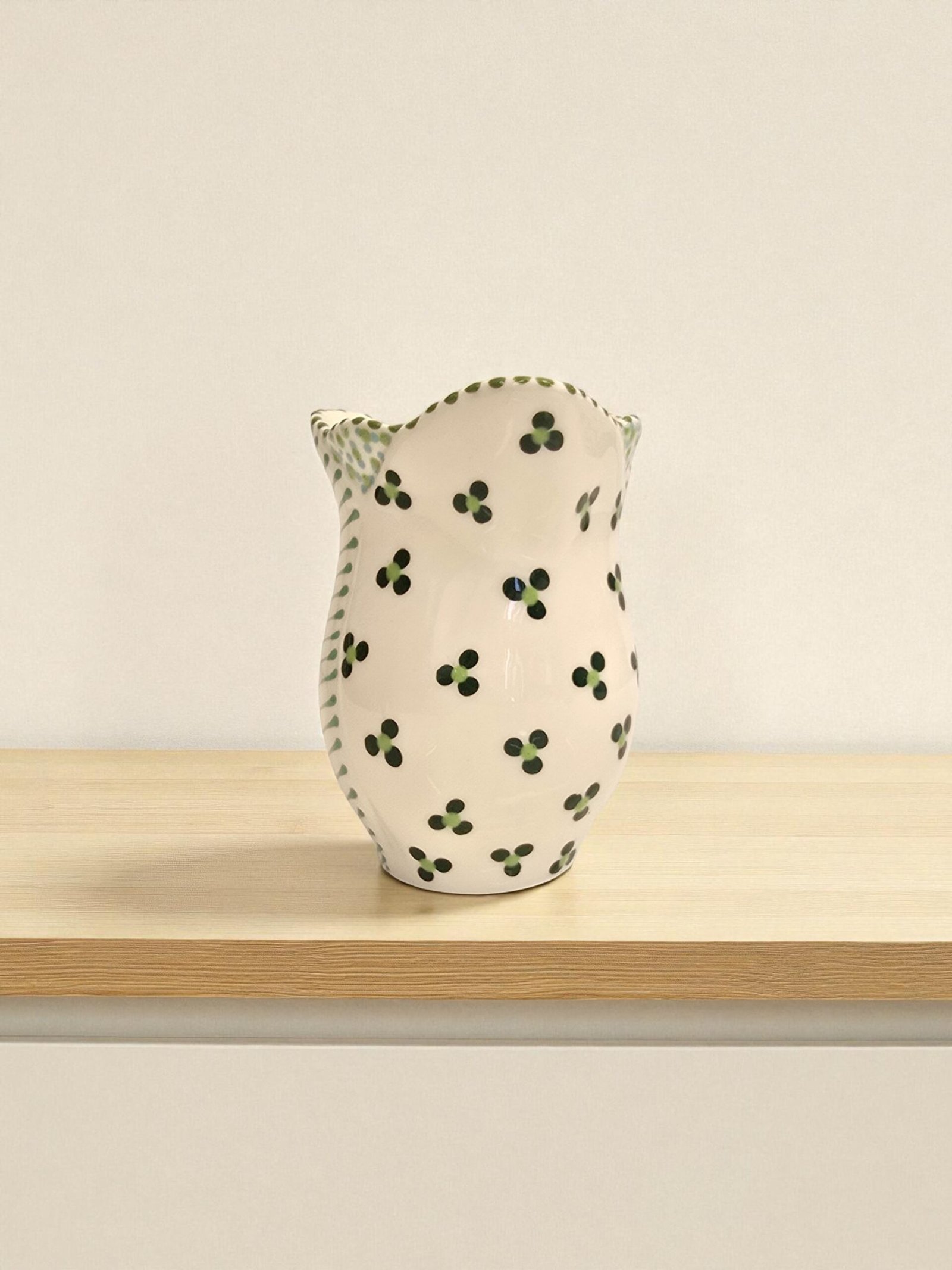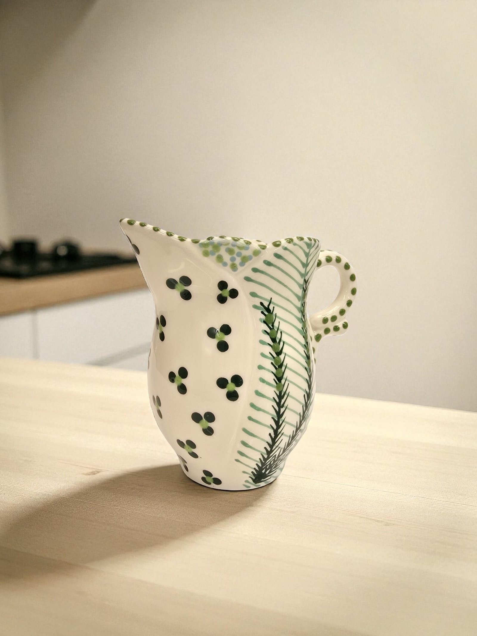 Un pezzo unico, realizzato e dipinto a mano da artigiani del Sudafrica. La superficie in ceramica bianca è impreziosita da delicati ornamenti verdi, che donano un tocco di eleganza naturale e artigianale alla tavola. Perfetta per servire latte o salse con stile e raffinatezza.