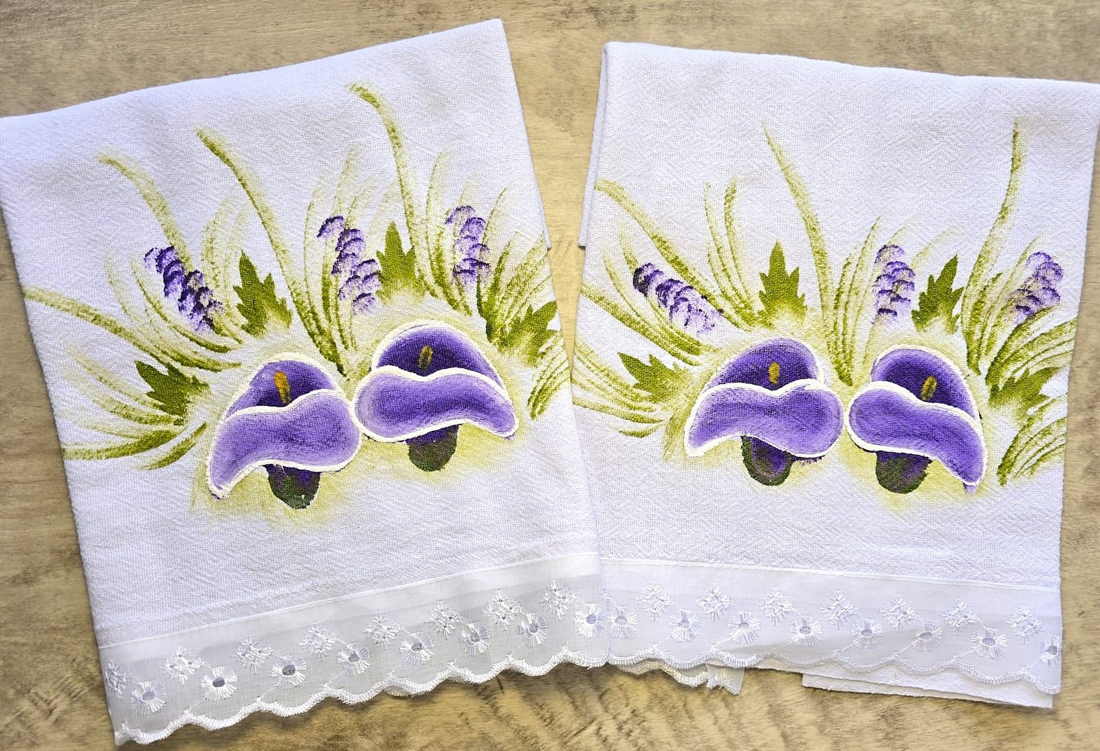 Strofinaccio in cotone dipinto a mano con un elegante fiore viola, rifinito con un delicato bordino arricciato. Morbido, assorbente e realizzato artigianalmente, dona un tocco romantico e raffinato alla cucina.