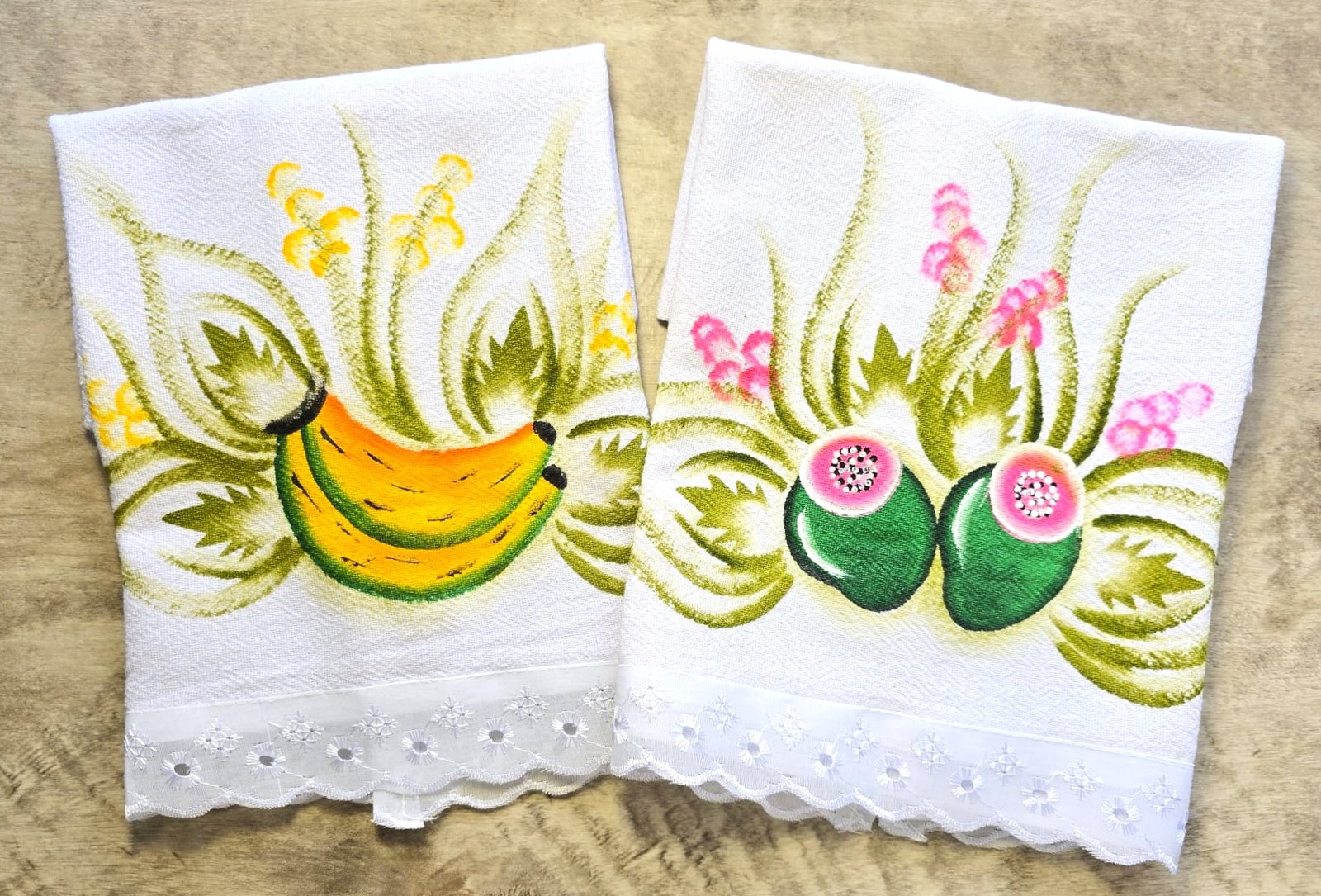 Set di 2 strofinacci in cotone dipinti a mano: uno con vivaci banane e l’altro con succose guava. Entrambi rifiniti con un delicato bordino arricciato, portano colore e allegria alla tua cucina con un tocco artigianale unico.